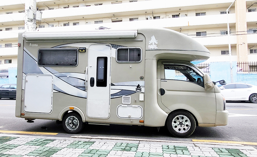 작업 차량이 와이드형 캠핑카 차량이라